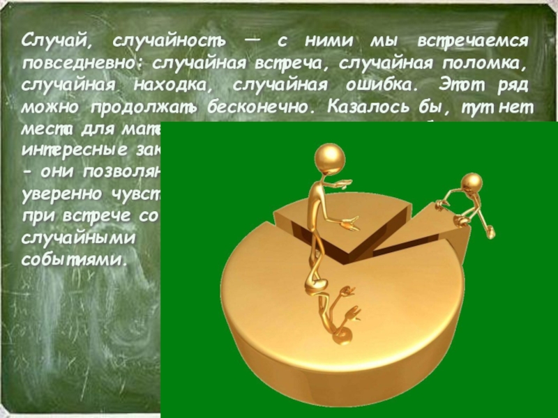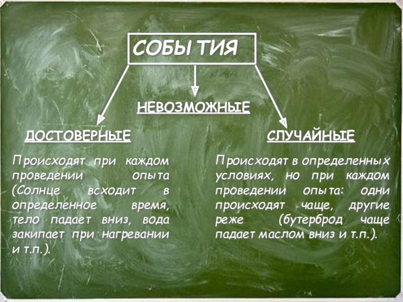 Происходят в определенных условиях, но при каждом проведении опыта: одни происходят чаще, другие реже (бутерброд чаще падает маслом вниз и т.п.).