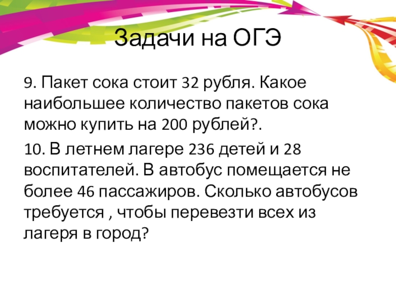 Задачи на ОГЭ9. Пакет сока стоит 32 рубля. Какое наибольшее количество пакетов сока можно купить на 200