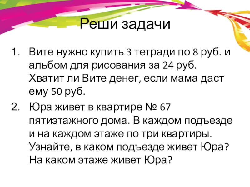 Реши задачиВите нужно купить 3 тетради по 8 руб. и альбом для рисования за 24 руб. Хватит ли Вите денег, если мама даст ему 50 руб.Юра живет в квартире № 67 пятиэтажного дома. В каждом подъезде