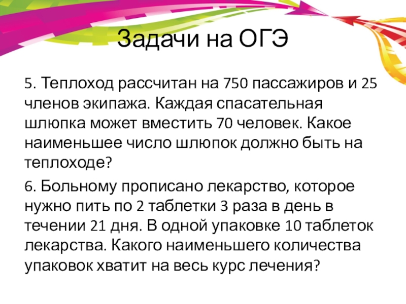 Задачи на ОГЭ5. Теплоход рассчитан на 750 пассажиров и 25 членов экипажа. Каждая спасательная шлюпка может вместить