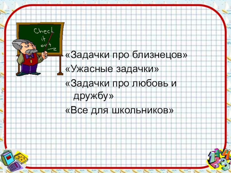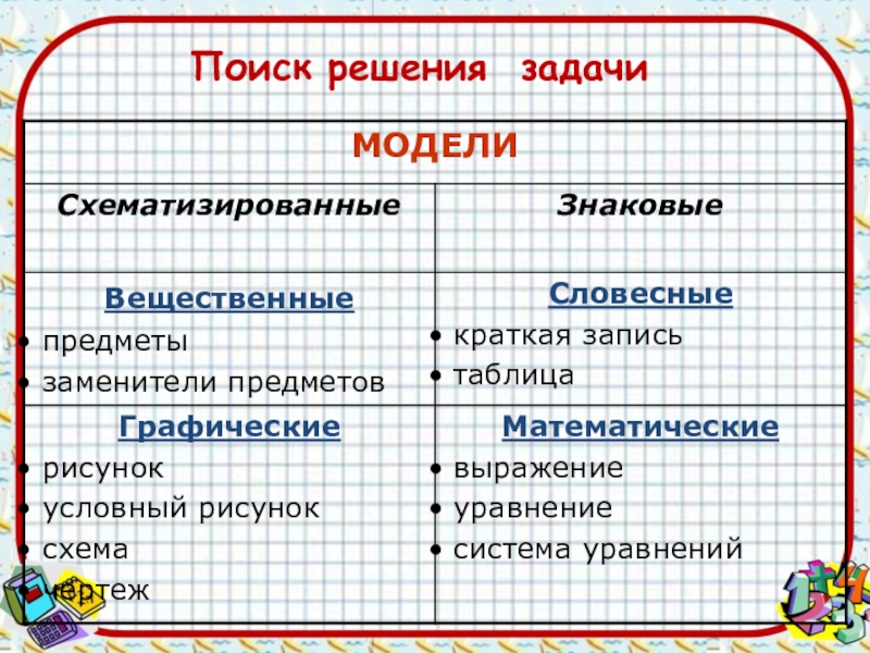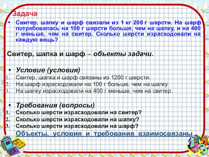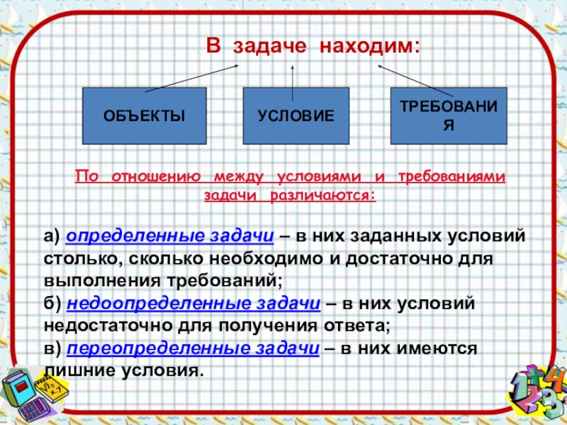 задачи – в них заданных условий столько, сколько необходимо и достаточно для выполнения требований;