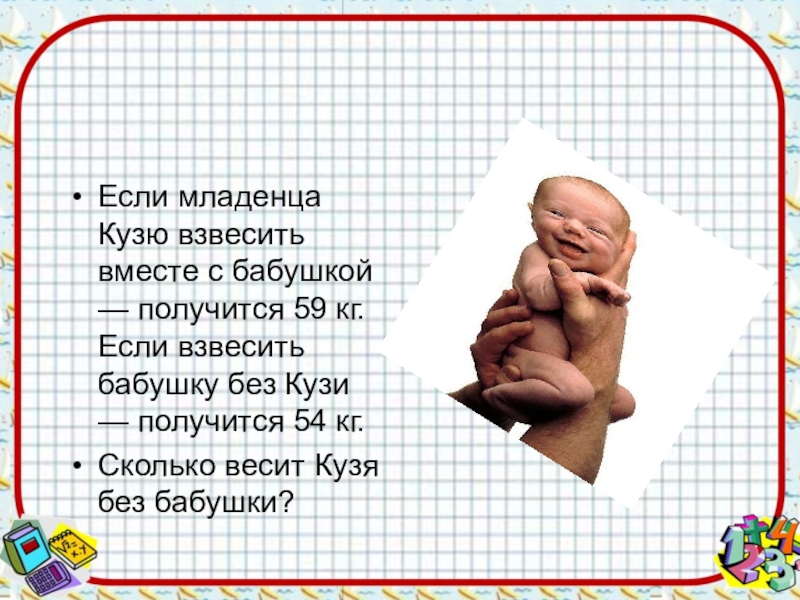 Слайд 23Если младенца Кузю взвесить вместе с бабушкой — получится 59 кг. Если
