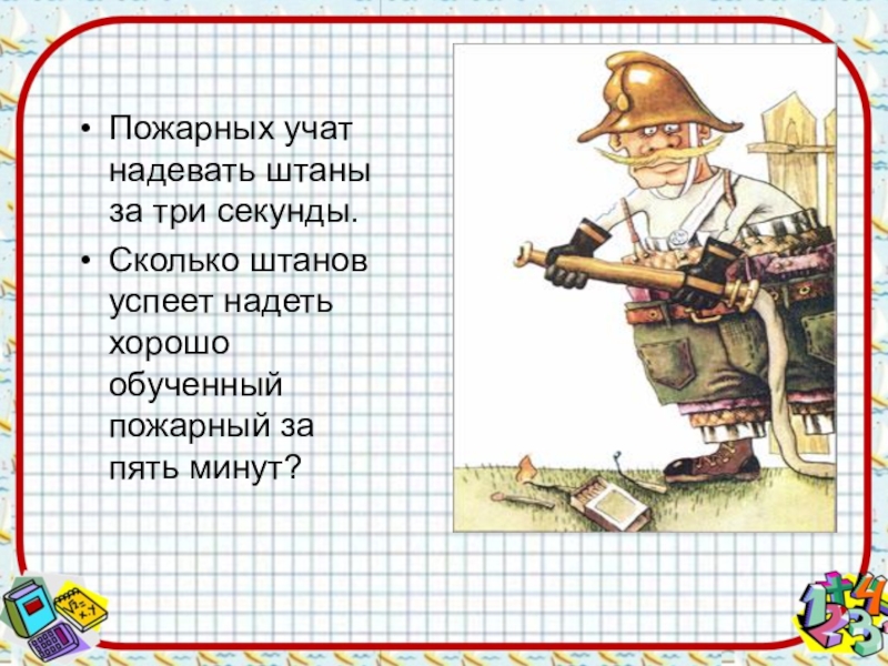 Слайд 21Пожарных учат надевать штаны за три секунды.