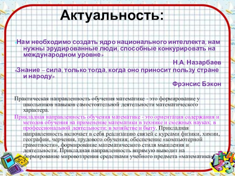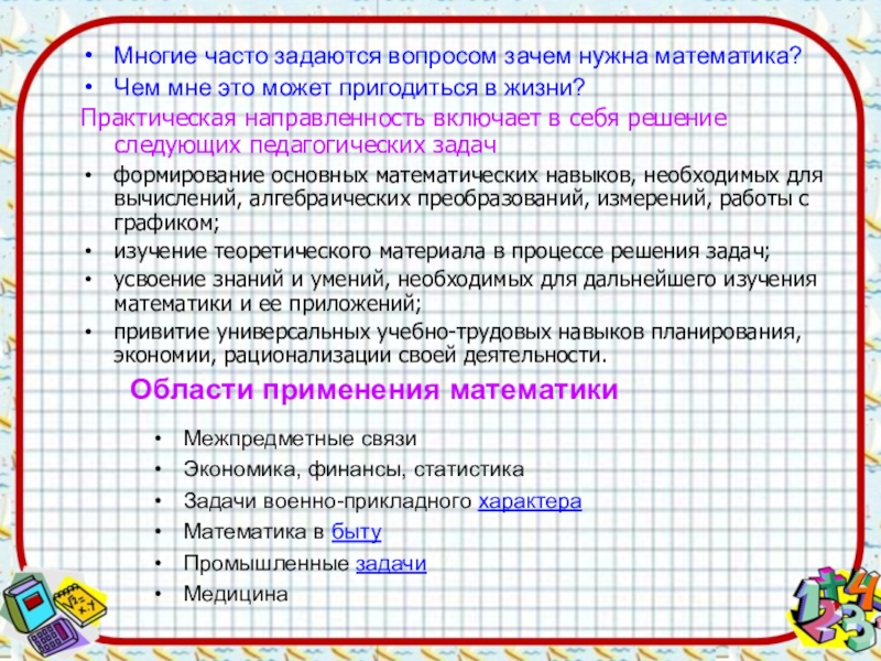 Практическая направленность обучения математике - это формирование у школьников навыков самостоятельной деятельности математического характера.