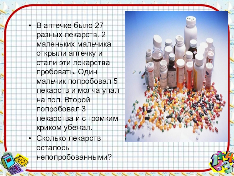 Слайд 22В аптечке было 27 разных лекарств. 2 маленьких мальчика открыли аптечку
