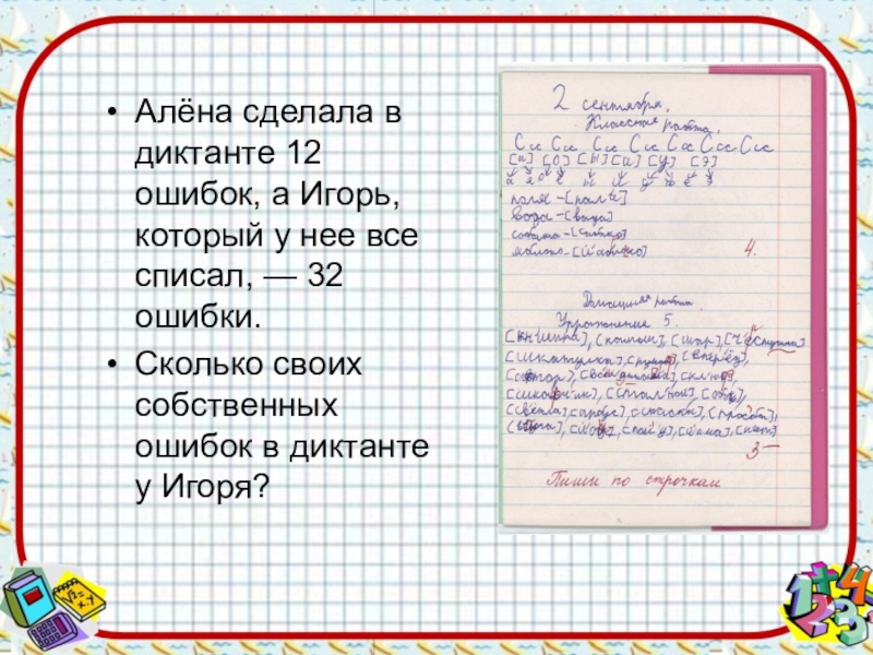 Слайд 24Алёна сделала в диктанте 12 ошибок, а Игорь, который у нее