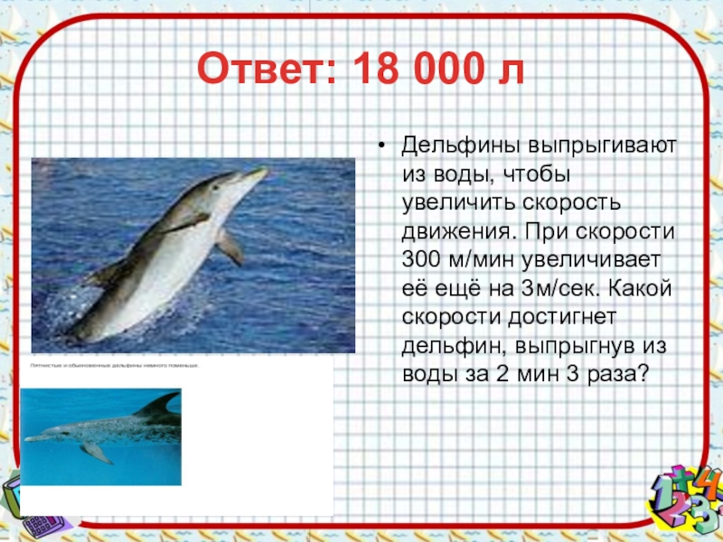 При скорости 300 м/мин увеличивает её ещё на 3м/сек. Какой скорости достигнет дельфин, выпрыгнув из воды за 2 мин 3 раза?