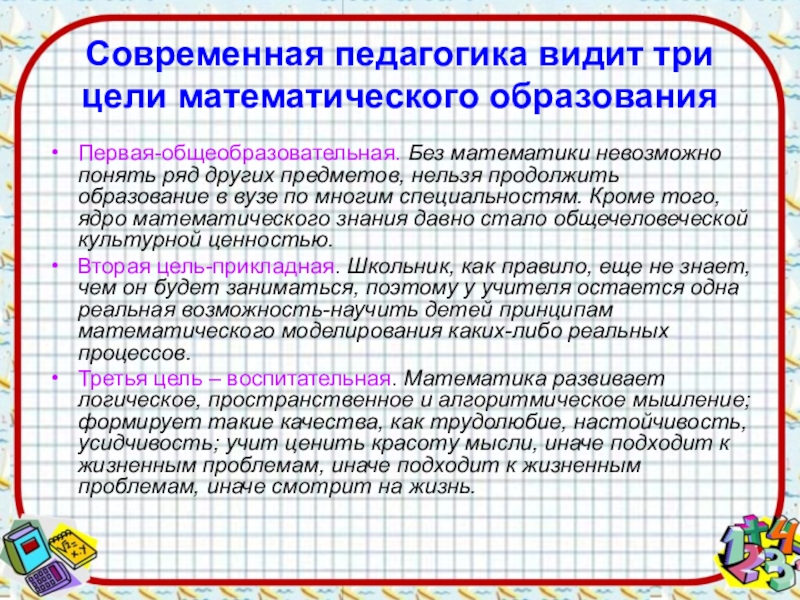 Третья цель – воспитательная. Математика развивает логическое, пространственное и алгоритмическое мышление; формирует такие качества, как трудолюбие, настойчивость, усидчивость; учит ценить красоту мысли, иначе подходит к жизненным проблемам, иначе подходит к жизненным проблемам, иначе смотрит на жизнь.