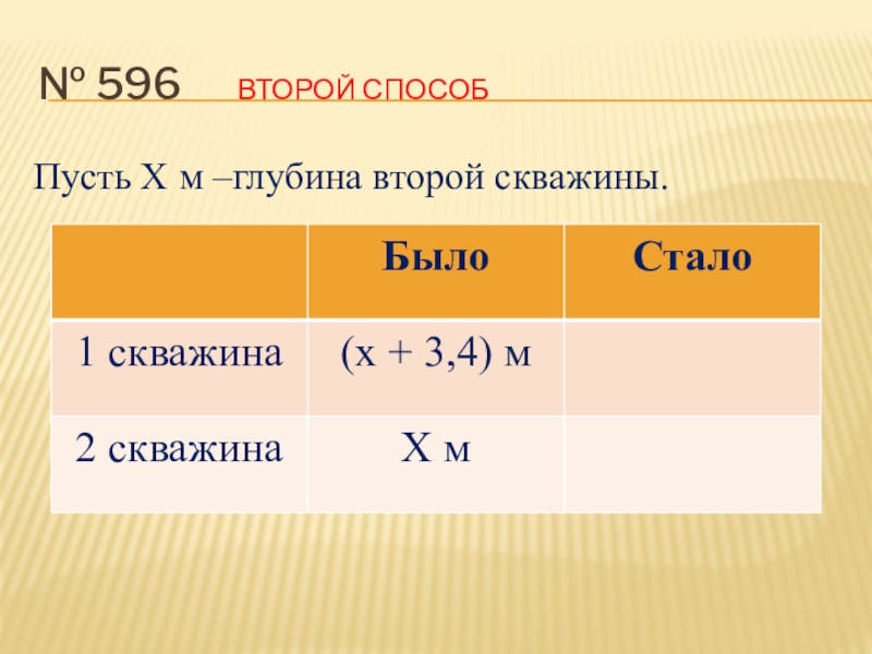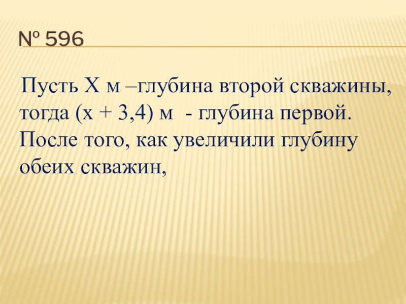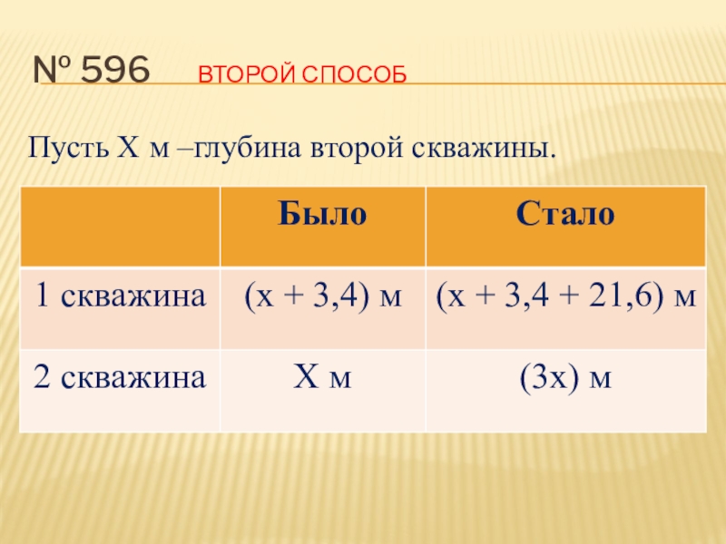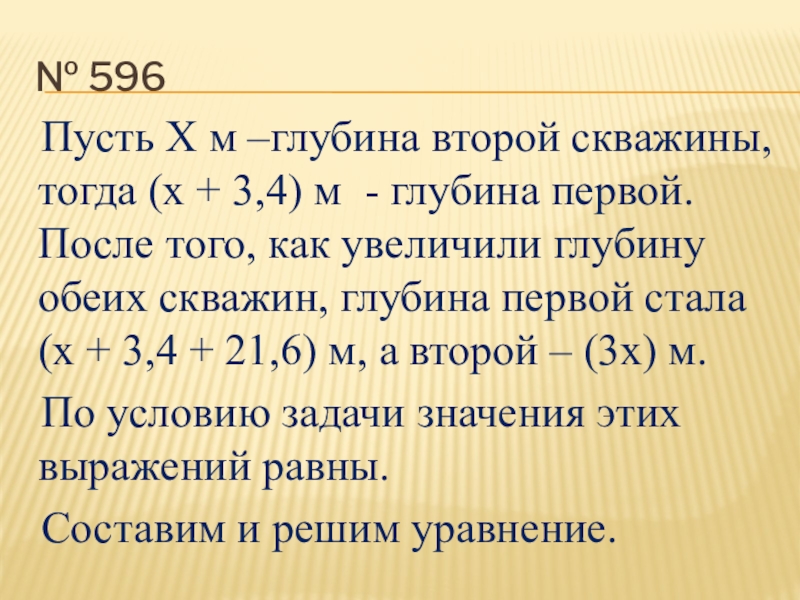 3,4) м - глубина первой. После того, как увеличили глубину обеих скважин, глубина первой стала (х + 3,4 + 21,6) м, а второй – (3х) м.