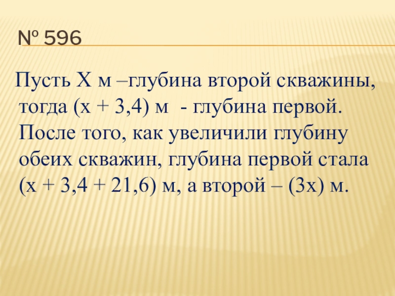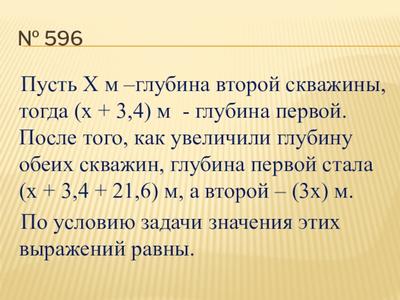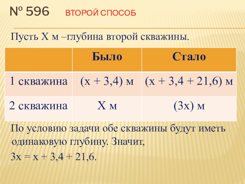 + 3,4) м - глубина первой. После того, как увеличили глубину обеих скважин, глубина первой стала (х + 3,4 + 21,6) м, а второй – (3х) м.