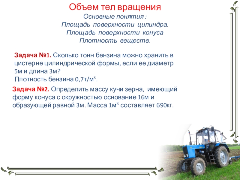 Задача №2. Определить массу кучи зерна, имеющий форму конуса с окружностью основание 16м и образующей равной 3м. Масса 1м3 составляет 690кг.