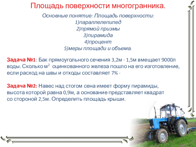 Задача№2. 130т силоса (Р=0,65т/м3) заложили в траншею, поперечное сечение которой прямоугольник. Глубина траншеи 3,6м ,ширина 3,12м. Определить длину траншеи.