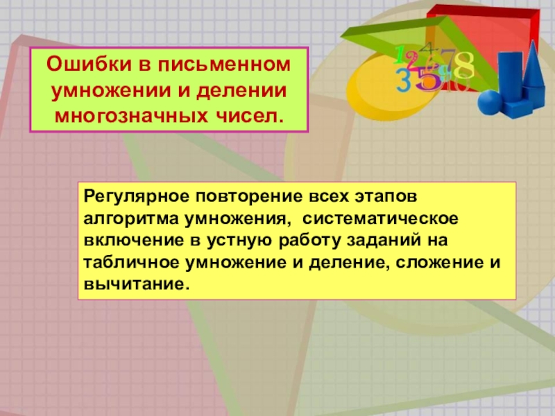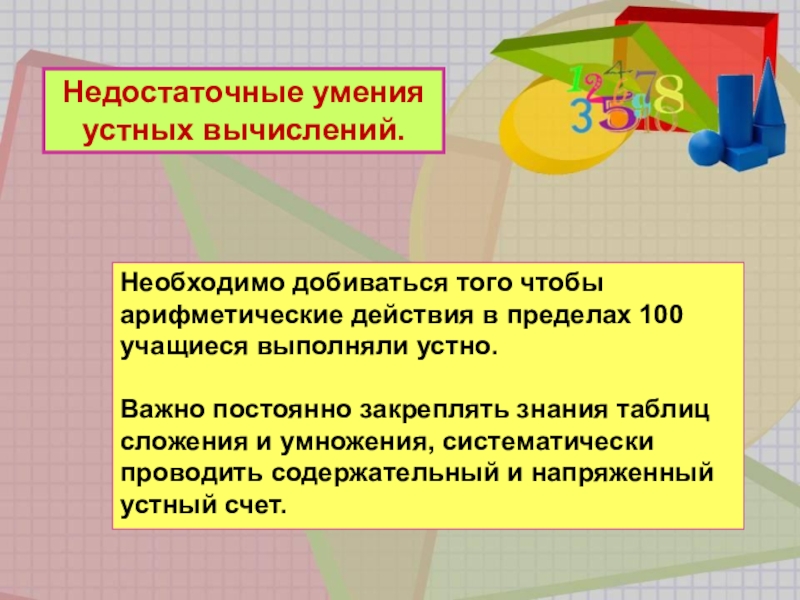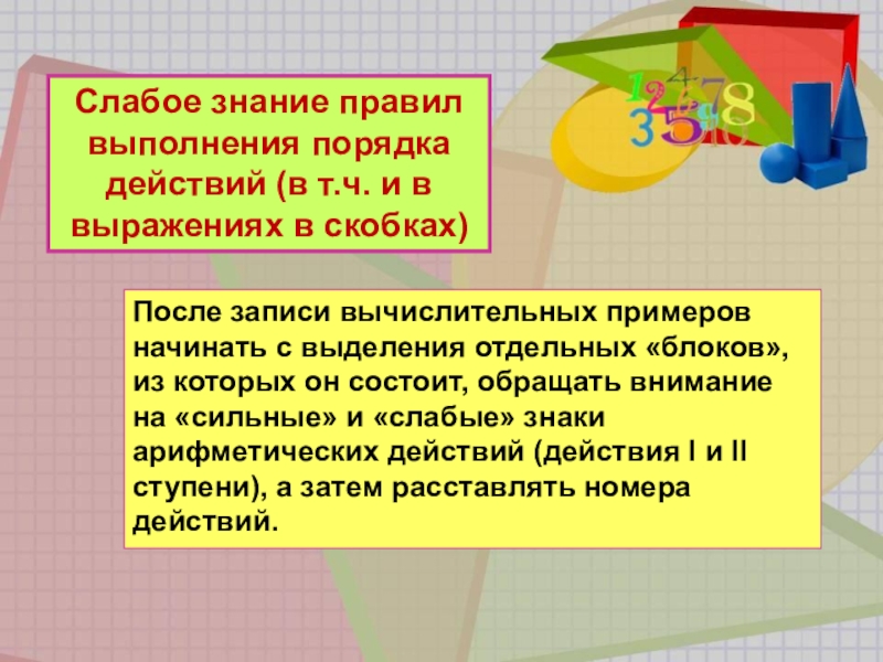 После записи вычислительных примеров начинать с выделения отдельных «блоков», из которых он состоит, обращать внимание на «сильные» и «слабые» знаки арифметических действий (действия I и II ступени), а затем расставлять номера действий.