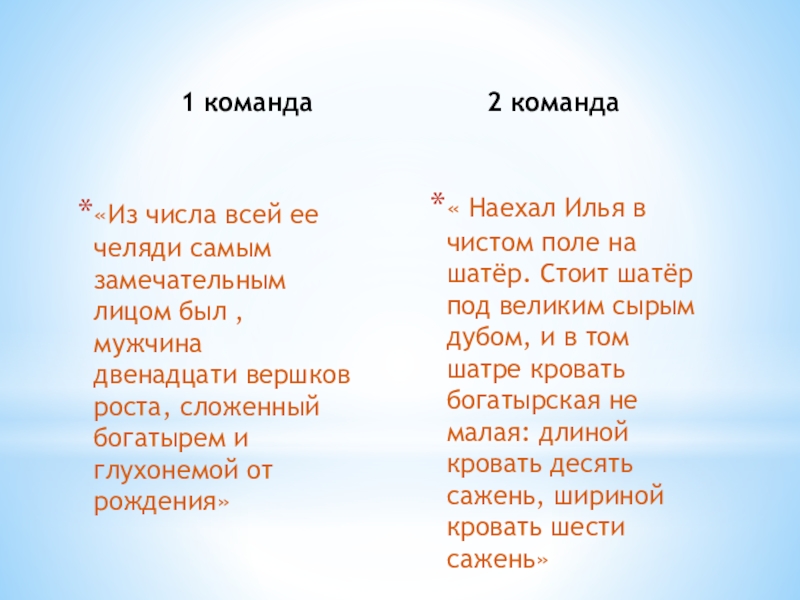 « Наехал Илья в чистом поле на шатёр. Стоит шатёр под великим сырым дубом, и в том шатре кровать богатырская не малая: длиной кровать десять сажень, шириной кровать шести сажень»