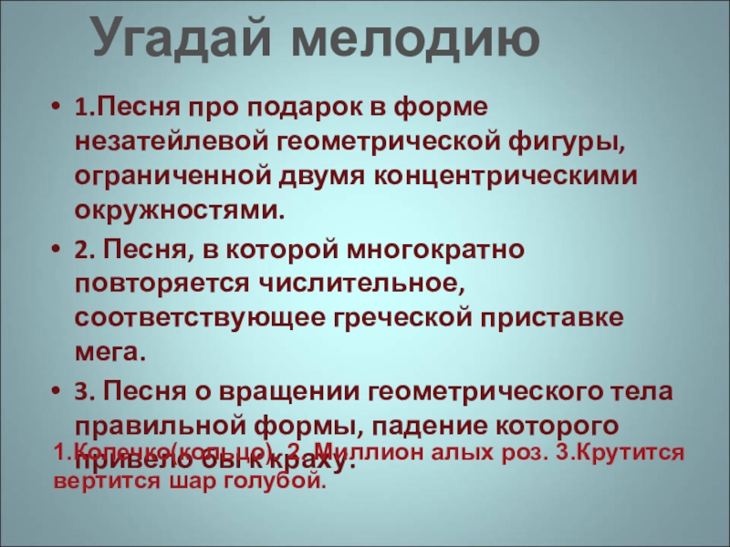 1.Колечко(кольцо). 2. Миллион алых роз. 3.Крутится вертится шар голубой.