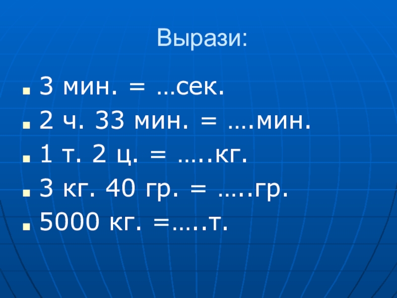 Вырази:3 мин. = …сек.2 ч. 33 мин. = ….мин.1 т. 2 ц. = …..кг.3 кг. 40 гр.
