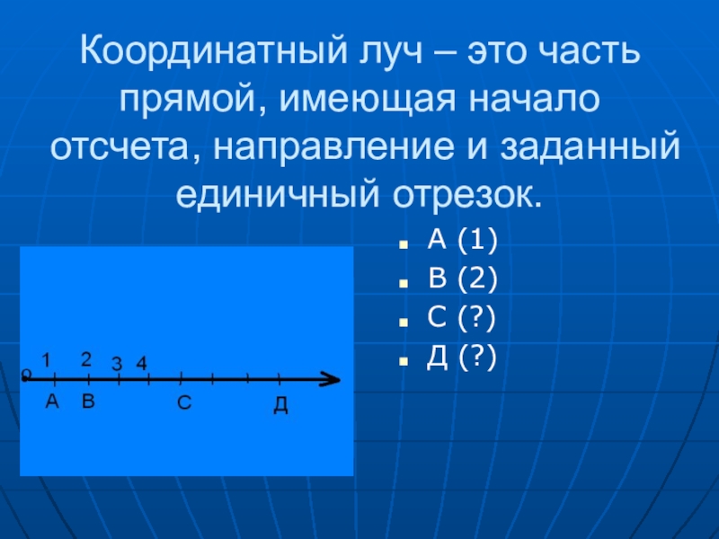 Координатный луч – это часть прямой, имеющая начало отсчета, направление и заданный единичный отрезок.А (1)В (2)С (?)Д