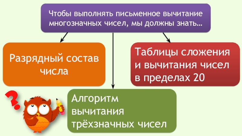 Чтобы выполнять письменное вычитание многозначных чисел, мы должны знать…