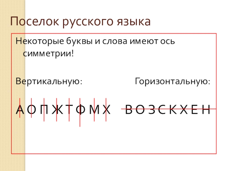 Поселок русского языкаНекоторые буквы и слова имеют ось симметрии!Вертикальную: