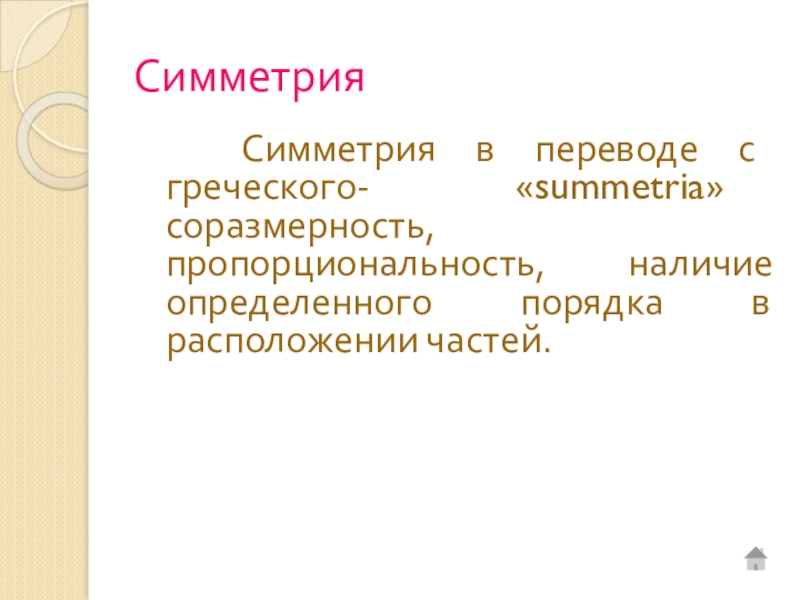 Симметрия    Симметрия в переводе с греческого- «summetria» соразмерность, пропорциональность, наличие определенного порядка в расположении