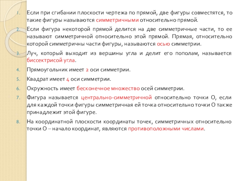 Если при сгибании плоскости чертежа по прямой, две фигуры совместятся, то такие фигуры называются симметричными относительно прямой.Если