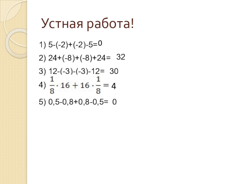 Устная работа!1) 5-(-2)+(-2)-5=2) 24+(-8)+(-8)+24=3) 12-(-3)-(-3)-12=4)5) 0,5-0,8+0,8-0,5=  0304320