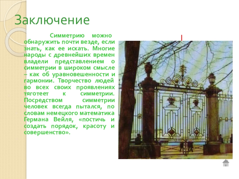 Заключение   Симметрию можно обнаружить почти везде, если знать, как ее искать. Многие народы с древнейших