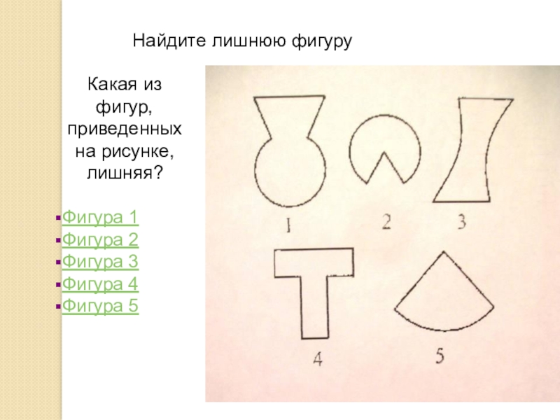Найдите лишнюю фигуруКакая из фигур, приведенных на рисунке, лишняя?Фигура 1Фигура 2Фигура 3Фигура 4Фигура 5