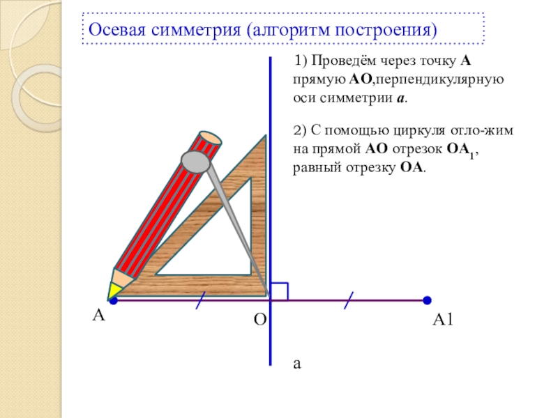 2) С помощью циркуля отло-жим на прямой АO отрезок OА1, равный отрезку OА.