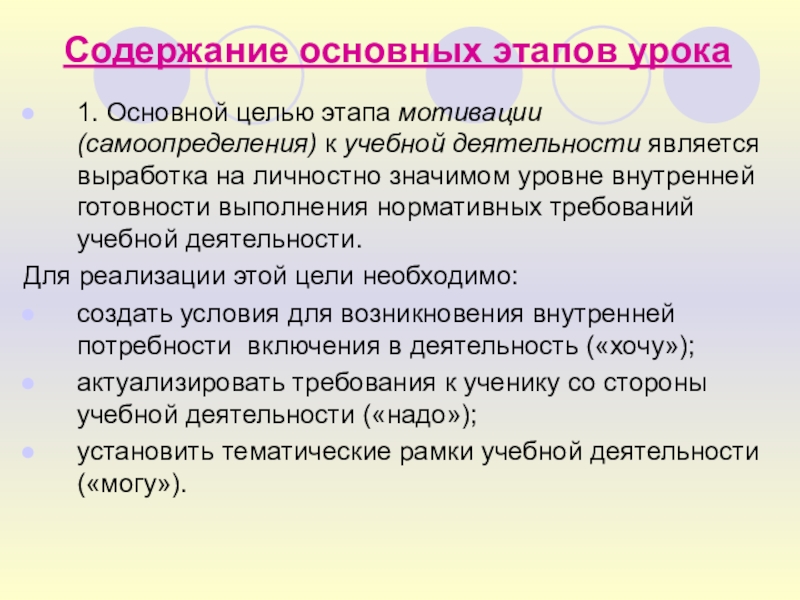 1. Основной целью этапа мотивации (самоопределения) к учебной