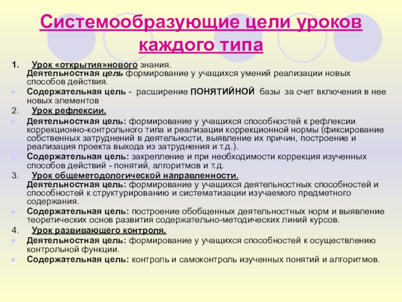 Слайд 7Системообразующие цели уроков каждого типа