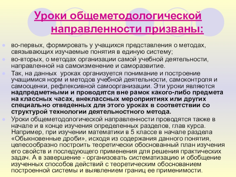 Уроки общеметодологической направленности проводятся также в начале и в конце изучения определенных разделов, глав курса. Например, при изучении математики в 5 классе в начале раздела «Обыкновенные дроби», исходя из содержания данного понятия, целесообразно построить теоретически обоснованный план изучения его свойств и последующего применения для решения практических задач. А в завершение - организовать систематизацию и обобщение изученных способов действий с теоретическим обоснованием построенной системы и выявлением границ ее применимости.