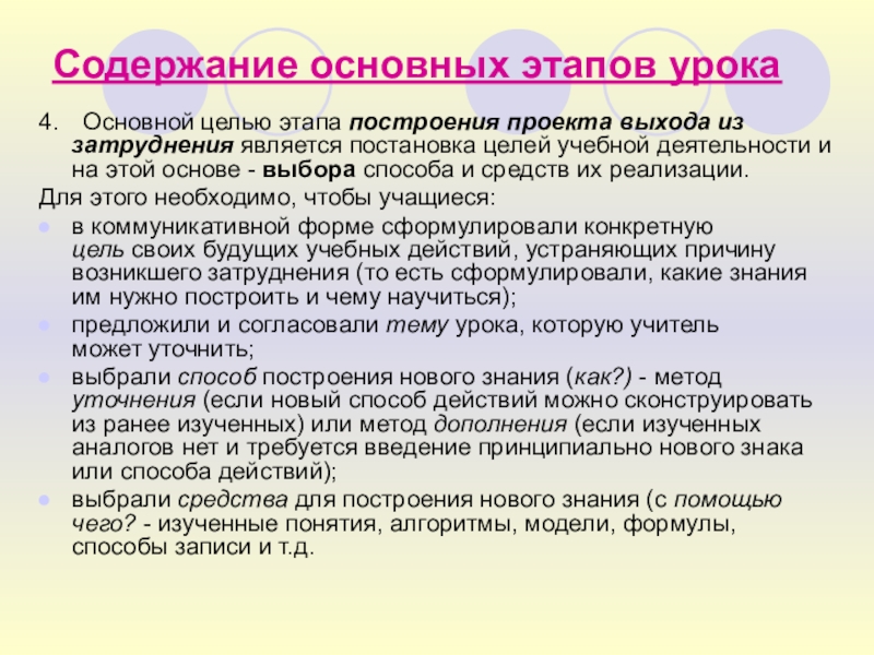 4) этап построения проекта выхода из затруднения;