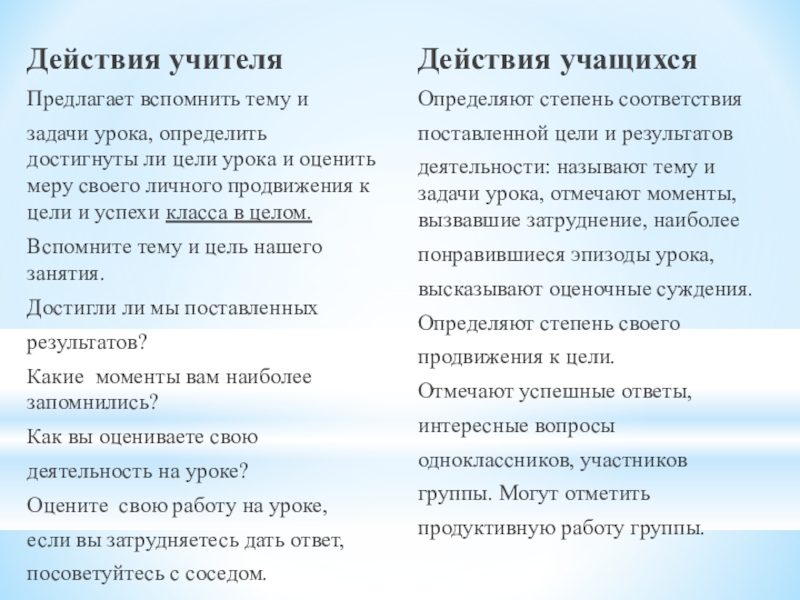 урока и оценить меру своего личного продвижения к цели и успехи класса в целом.