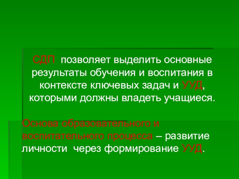 Слайд 2СДП позволяет выделить основные результаты обучения и воспитания