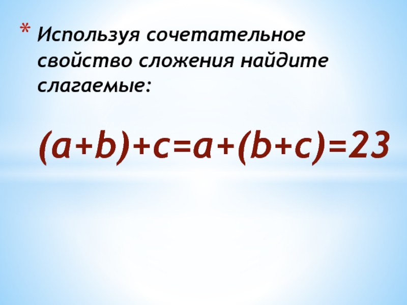 Слайд 11Используя сочетательное свойство сложения найдите слагаемые: (a+b)+c=a+(b+c)=23