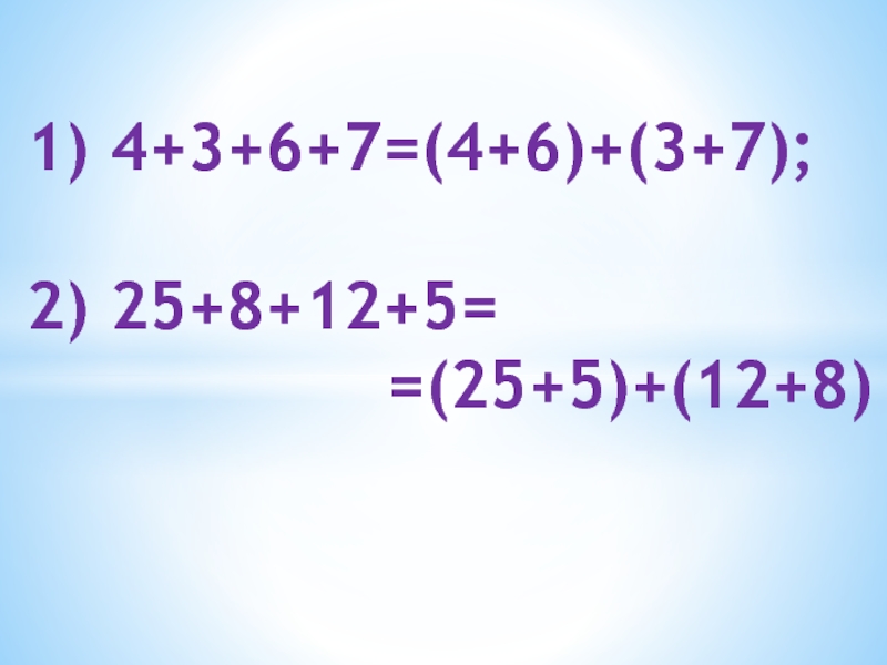 Слайд 81) 4+3+6+7=(4+6)+(3+7); 2) 25+8+12+5=