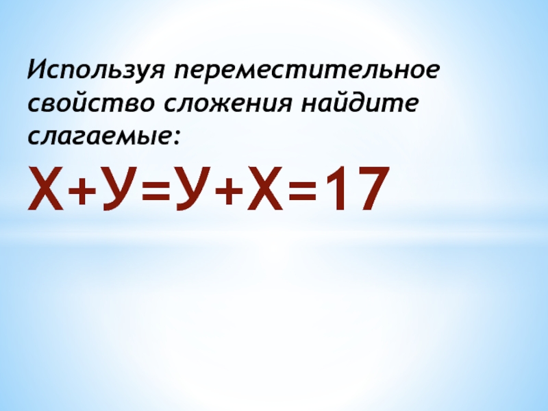 Слайд 10Используя переместительное свойство сложения найдите слагаемые: Х+У=У+Х=17