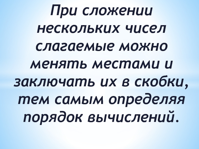 При сложении нескольких чисел слагаемые можно менять местами и заключать их в скобки, тем самым определяя порядок