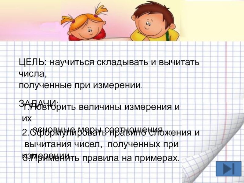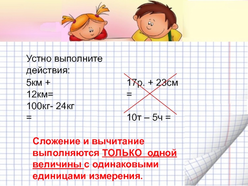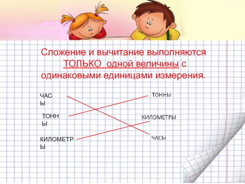 Сложение и вычитание выполняются ТОЛЬКО одной величины с одинаковыми единицами измерения.