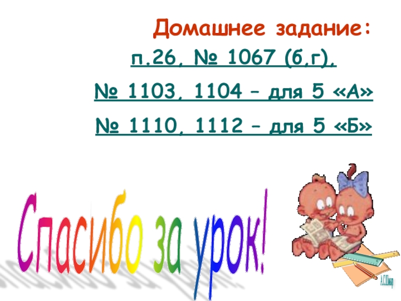 Домашнее задание: Спасибо за урок! п.26, № 1067 (б,г),№ 1103, 1104 – для 5 «А»№ 1110, 1112