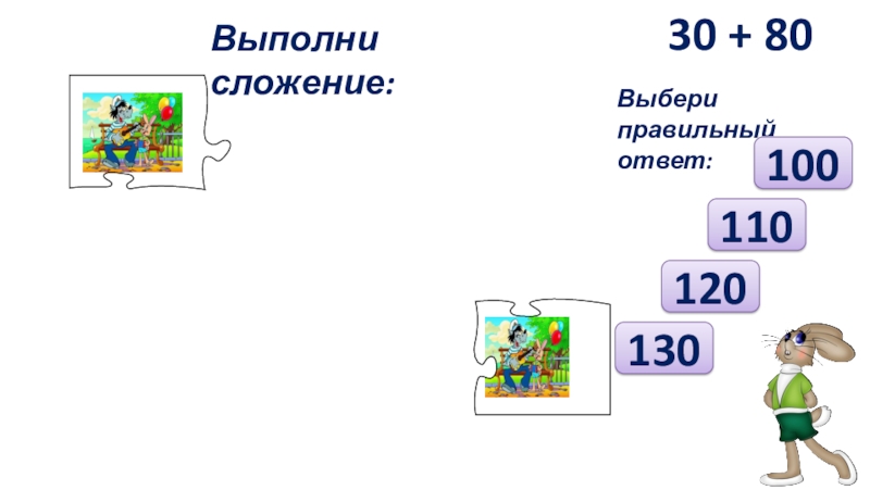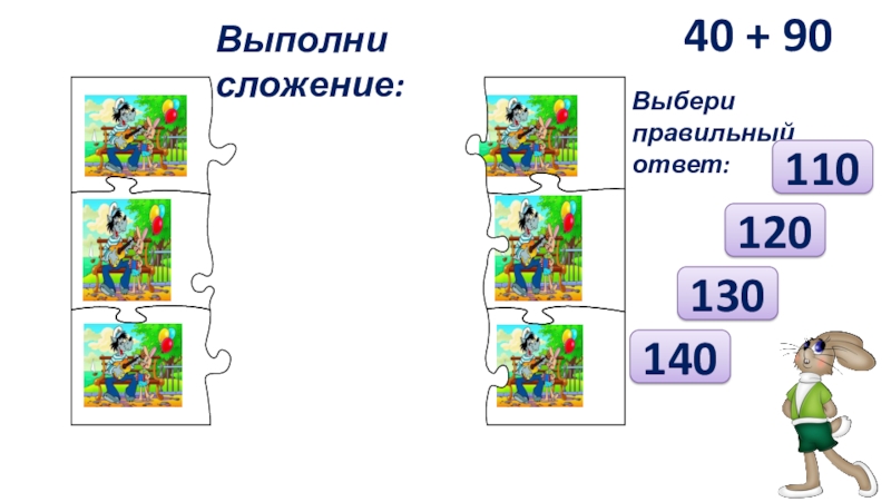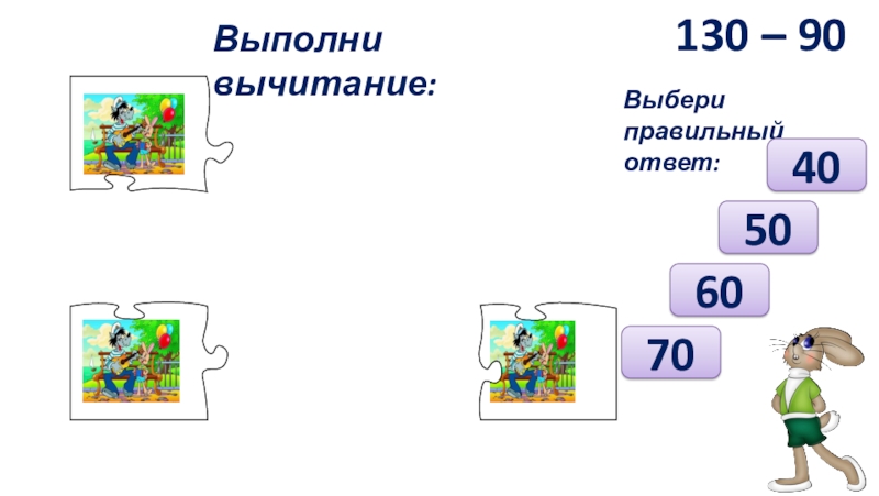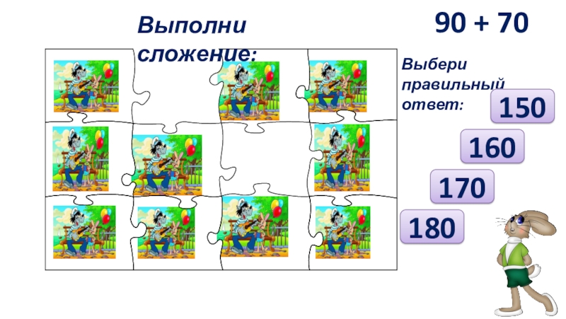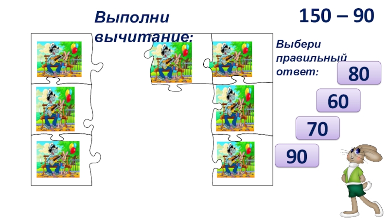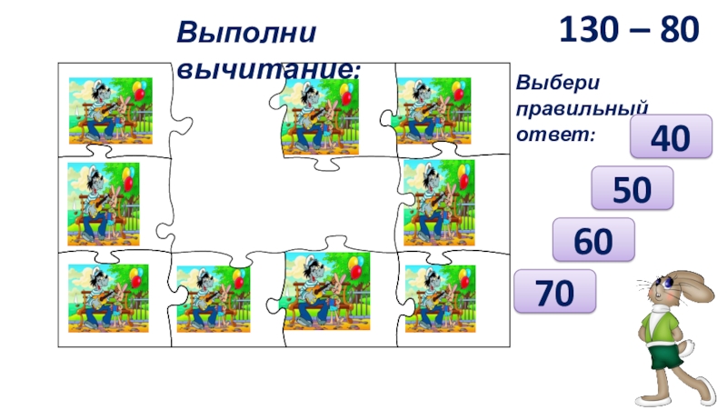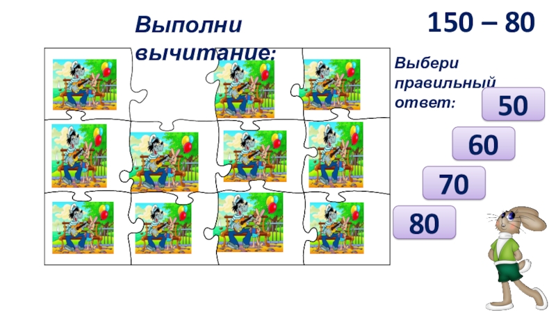 решить пример и найти ответ среди четырёх предложенных чисел. Если вы отвечаете верно, то появляется часть картинки и следующий пример. Если вы решите все примеры правильно, то увидите, как дружно живут волк и заяц из мультфильма «Ну, погоди!».