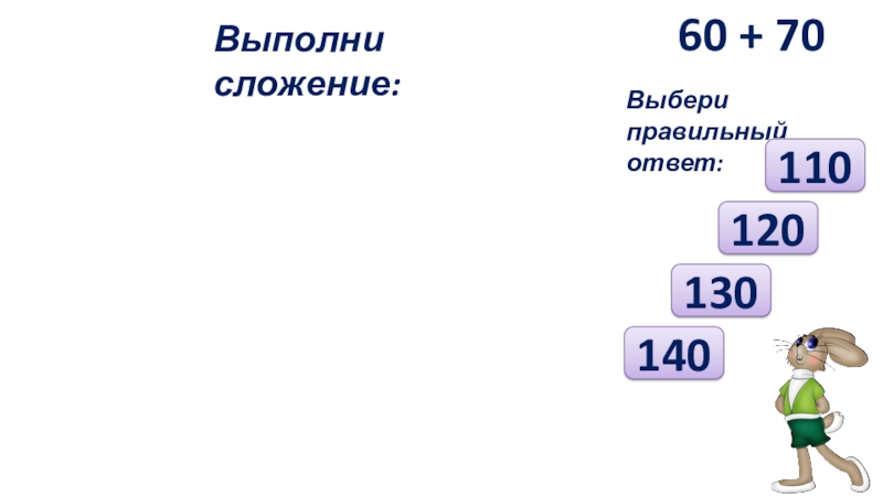Выполни сложение:60 + 70Выбери правильный ответ:110120130140
