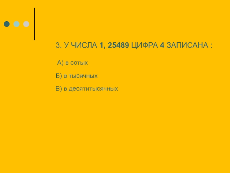 3. У ЧИСЛА 1, 25489 ЦИФРА 4 ЗАПИСАНА :  А) в сотых  Б) в тысячных