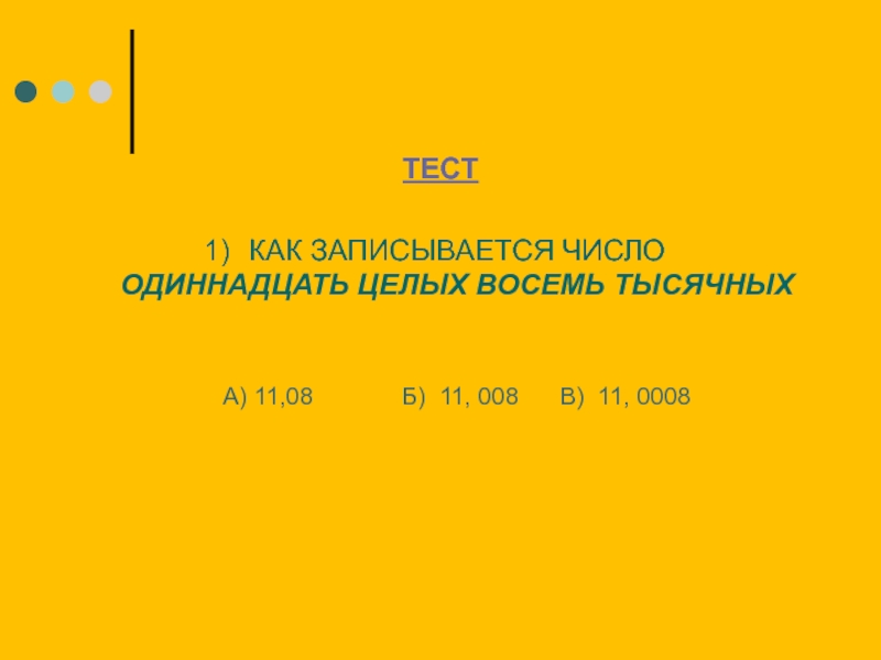 ТЕСТ КАК ЗАПИСЫВАЕТСЯ ЧИСЛО ОДИННАДЦАТЬ ЦЕЛЫХ ВОСЕМЬ ТЫСЯЧНЫХ А) 11,08 Б) 11, 008 В) 11, 0008