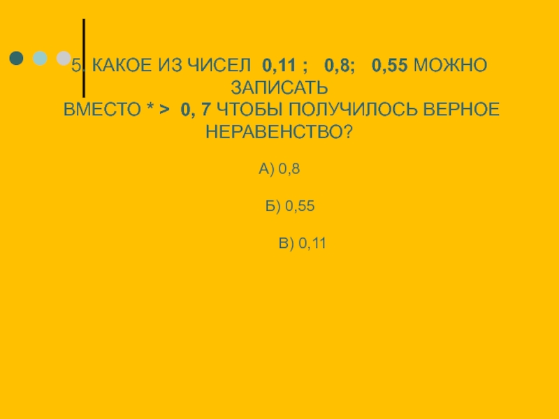 5. КАКОЕ ИЗ ЧИСЕЛ 0,11 ;  0,8;  0,55 МОЖНО ЗАПИСАТЬ ВМЕСТО * > 0, 7