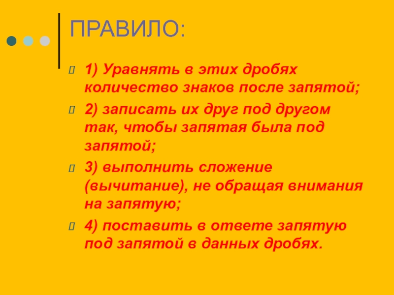 ПРАВИЛО:1) Уравнять в этих дробях количество знаков после запятой;2) записать их друг под другом так, чтобы запятая