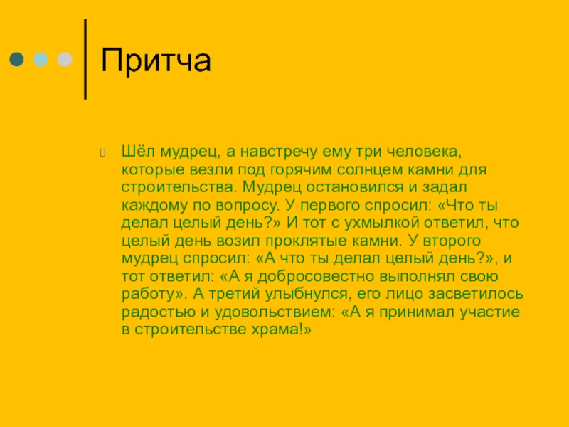 солнцем камни для строительства. Мудрец остановился и задал каждому по вопросу. У первого спросил: «Что ты делал целый день?» И тот с ухмылкой ответил, что целый день возил проклятые камни. У второго мудрец спросил: «А что ты делал целый день?», и тот ответил: «А я добросовестно выполнял свою работу». А третий улыбнулся, его лицо засветилось радостью и удовольствием: «А я принимал участие в строительстве храма!»