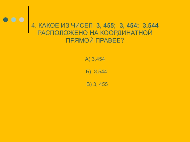 4. КАКОЕ ИЗ ЧИСЕЛ 3, 455; 3, 454; 3,544 РАСПОЛОЖЕНО НА КООРДИНАТНОЙ ПРЯМОЙ ПРАВЕЕ? А) 3,454