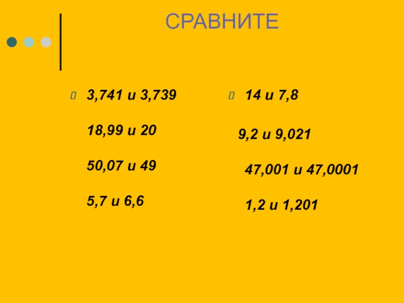СРАВНИТЕ3,741 и 3,739  18,99 и 20  50,07 и 49  5,7 и 6,614 и 7,8